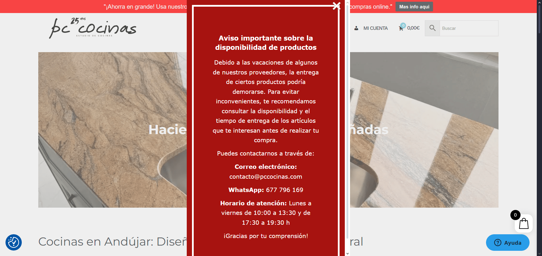 En nuestra web tenemos una barra informativa en la parte de arriba de nuestra pagina de Inicio donde destacamos noticias o novedades de nuestros productos, pero dicha barra no la suelen ver los clientes, pasa desapercibida. Ahora en el mes de Agosto ponemos un aviso que antes de comprar consulten disponibilidad por que nuestros proveedores en este mes están de vacaciones y nos gustaría poner algo como una ventana emergente por ejemplo para que los clientes les aparezca y nos avisen antes de comprar.