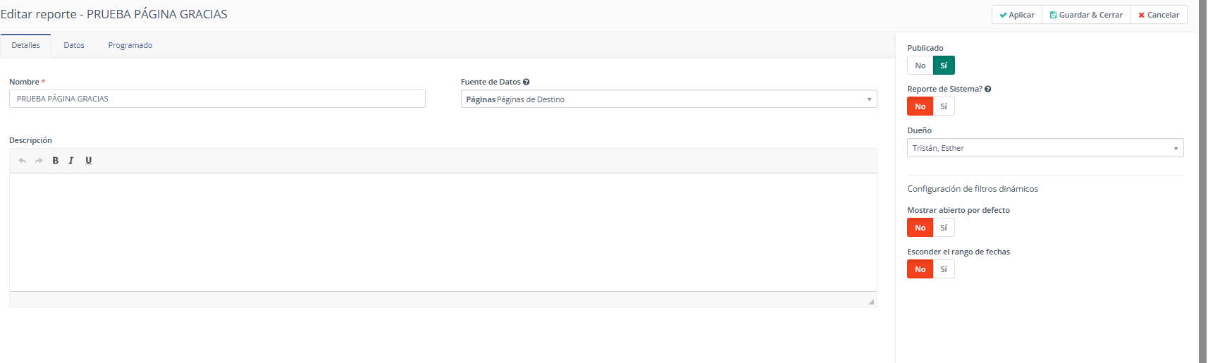 Tengo generado un reporte que muestra las visitas de las páginas de destino pero al meter en el filtro los periodos específicos, me da el total de visitas que he conseguido hasta día de hoy. Adjunto dos pantallazos con distintos periodos para que veais que no cambia el número de visitas.