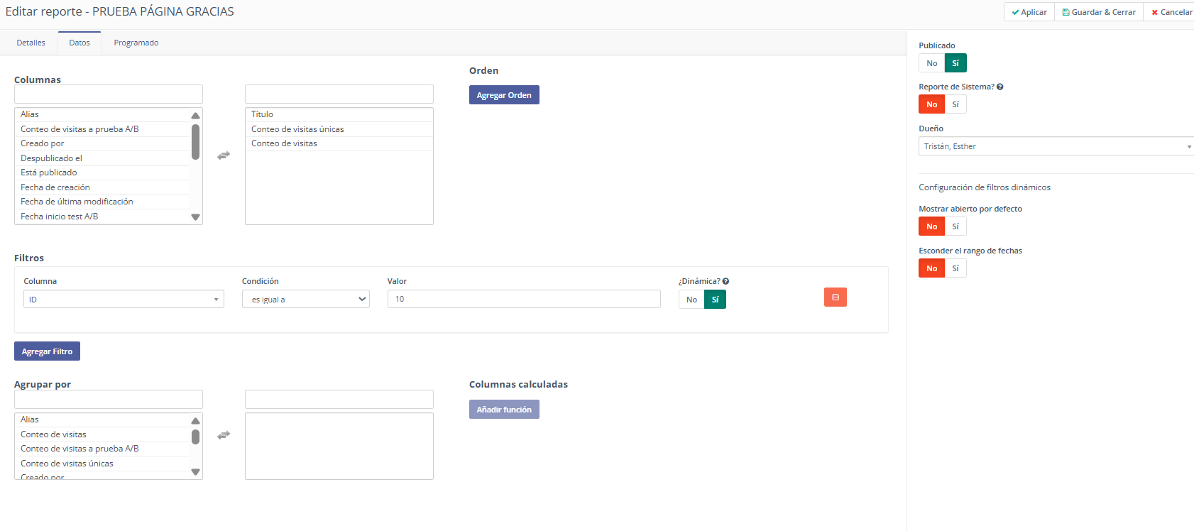 Luego seleciona en columnas titulo, url, fecha de visita y agrupa el informe por titulo para que no se haga un reporte extenso, puedes colocar los datos tal como te envio en la captura