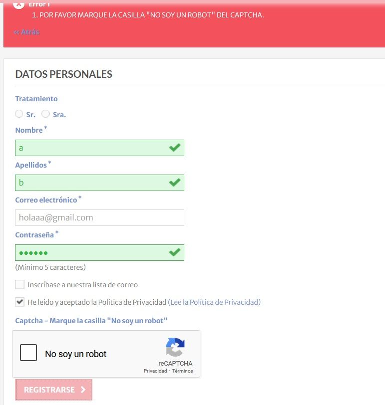 Hola, es que no es en ese paso la validación. Es en el siguiente, incluyes el email y aparece otra pantalla con el Captcha, adjunto pantallazo. Y lo he probado, el cliente no se crea si no se marca la casilla de "No soy un robot".