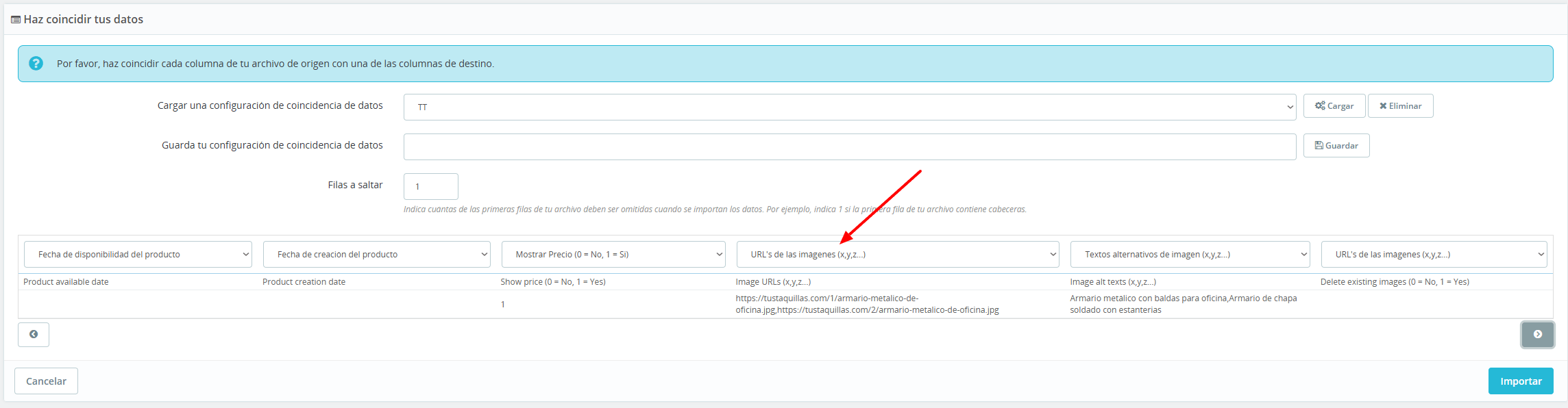 Luego debes ir mapeando las columnas, si las imagenes se sube en productos incorrectos es porque hay algo en los id cuando se asignan o el propio formato del archivo que estas subiendo.