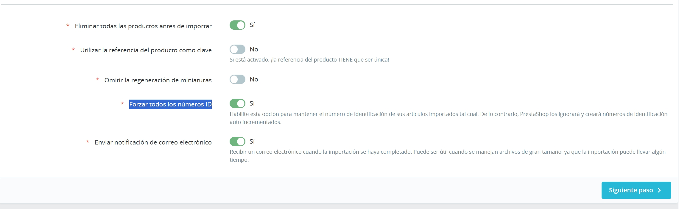 .- Importa el archivo, selecciona borrar todos los productos antes de importar e Forzar todos los números ID