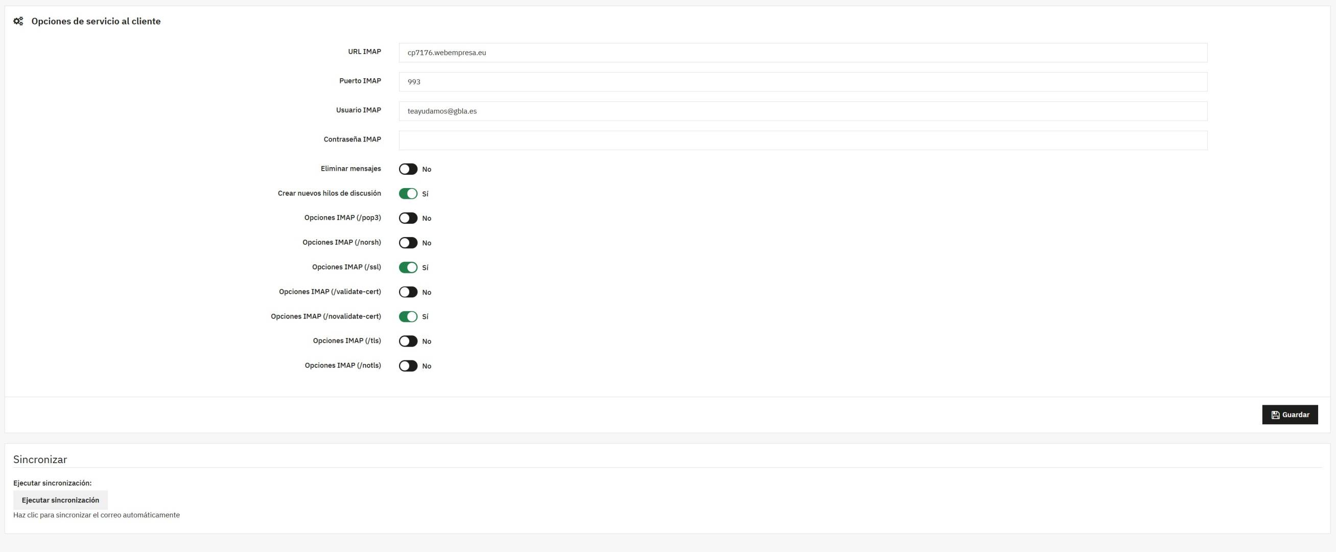 Hemos hablado con webempresa por ticket y nos dice lo siguiente "En cuanto al problema con IMAP, vemos que la web sí es capaz de conectarse correctamente a la cuenta de correo, por lo que el error al sincronizar debe venir por otra causa distinta, probablemente relacionada con la configuración o funcionamiento interno de PrestaShop o del propio módulo."
