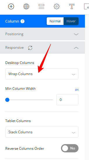 Entiendo que el error son los espacios que se estan añadiendo a la columna y muve los elementos, revisando un poco este constructor revisa que en la sección Responsive de la columnas tengas el diseño en desktop comp Wrap Columns