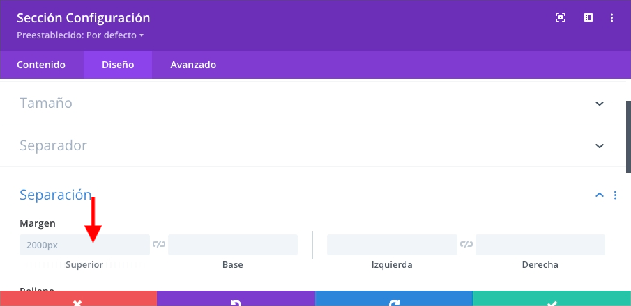 Disculpa el retraso en responderte, he estado fuera de la oficina. Efectivamente cambié el margen superior a 2000px de la sección, pero no solo de esa página. Le dí al botón derecho y se cambió de manera accidental en todas las secciones de la web, sin que pudiera revertirlo. Lo he cambiado manualmente en algunas páginas, pero me gustaría hacerlo de golpe en todas.