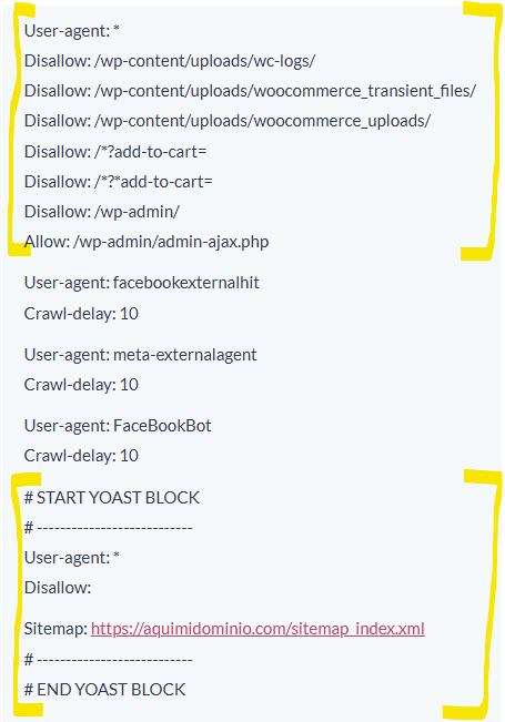 No me interesa que se desindexe el sitio de google, además utilizo Google Ads, solamente cerrar acceso a los bots de Meta. Adjunto pantallazo, lo que está en amarillo lo ha generado el plugin Yoast al crear el archivo robots.txt, lo del centro es lo que he añadido para intentar bloquear los bots.