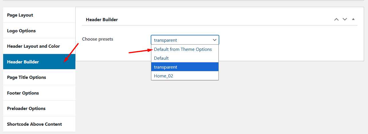 Por otro lado intentando recrear el comportamiento de la cabecera,, debes tener en cuenta que desde la vista de edición de cada página hay un apartado exclusivo para configurar la visualización relacionada con el tema. En estas opciones podemos definir cuál será el estilo del header predefinido
