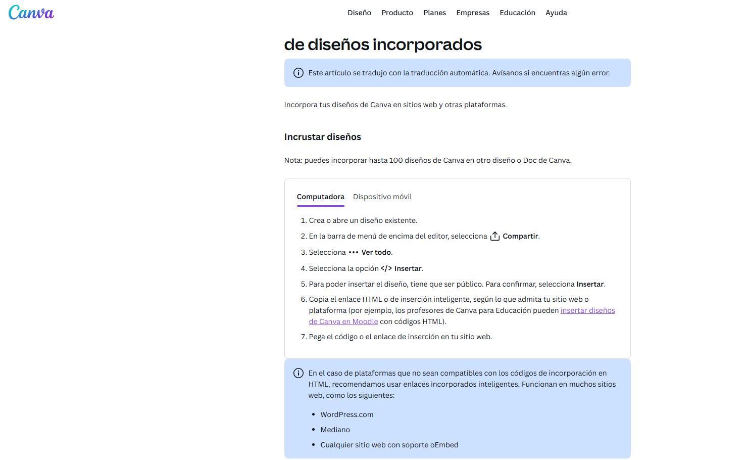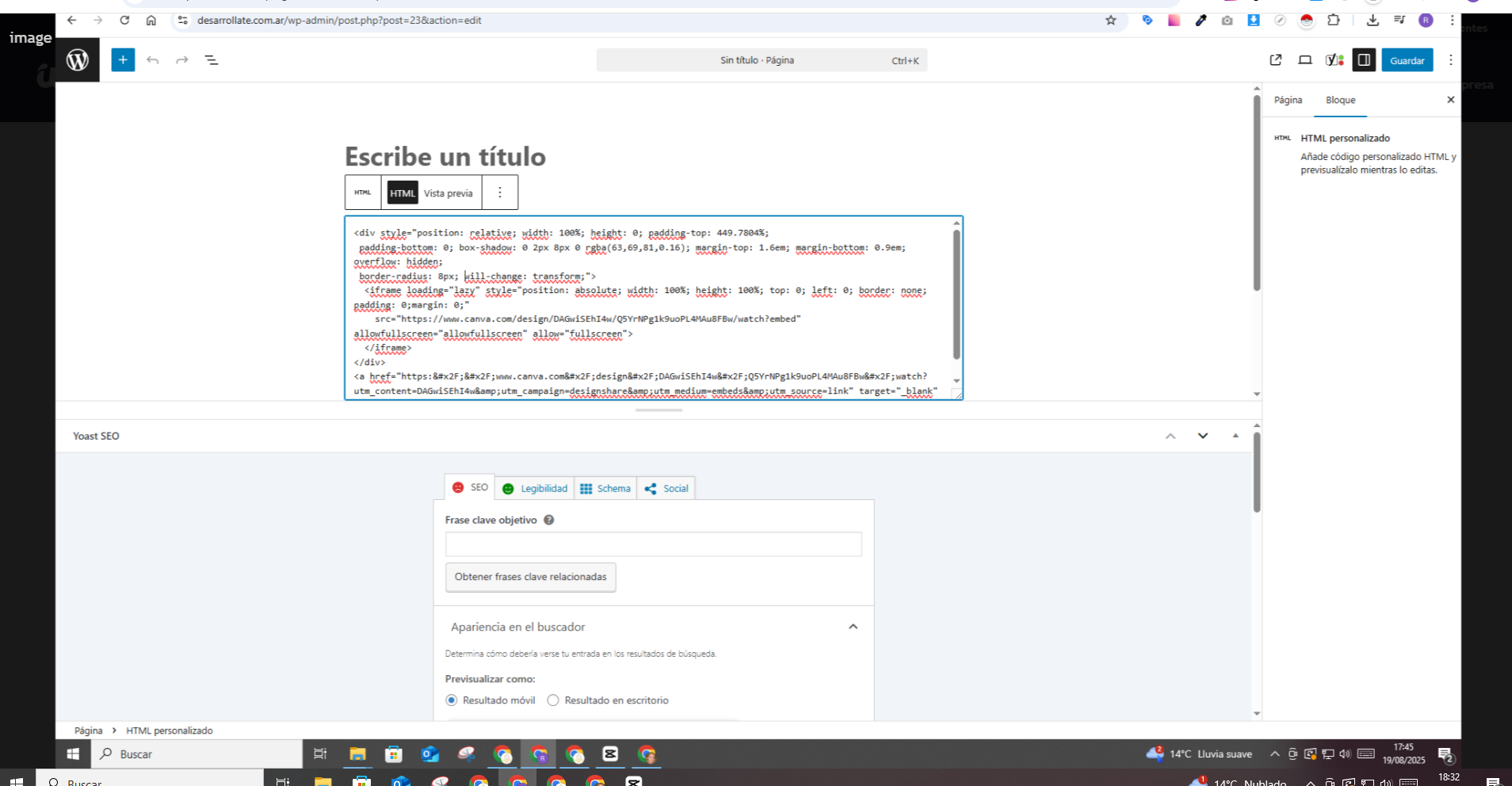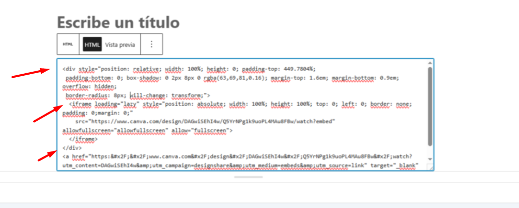 En tu captura de pantalla, parece que estás usando el código HTML para incrustar (iframe) en un bloque HTML personalizado. Si bien Canva proporciona un código para incrustar diseños, no todas las configuraciones de WordPress permiten iframes por defecto; algunos temas o plugins de seguridad pueden bloquearlos, lo que podría ser la razón por la que no se muestra correctamente.