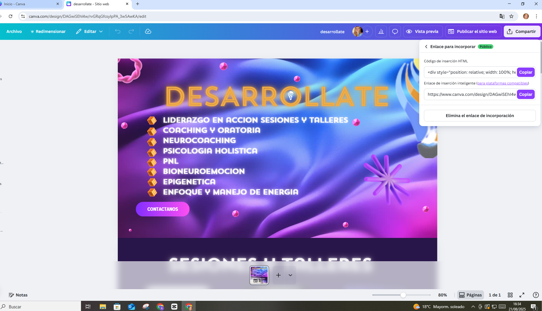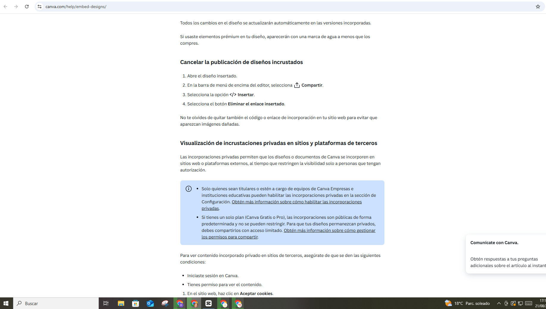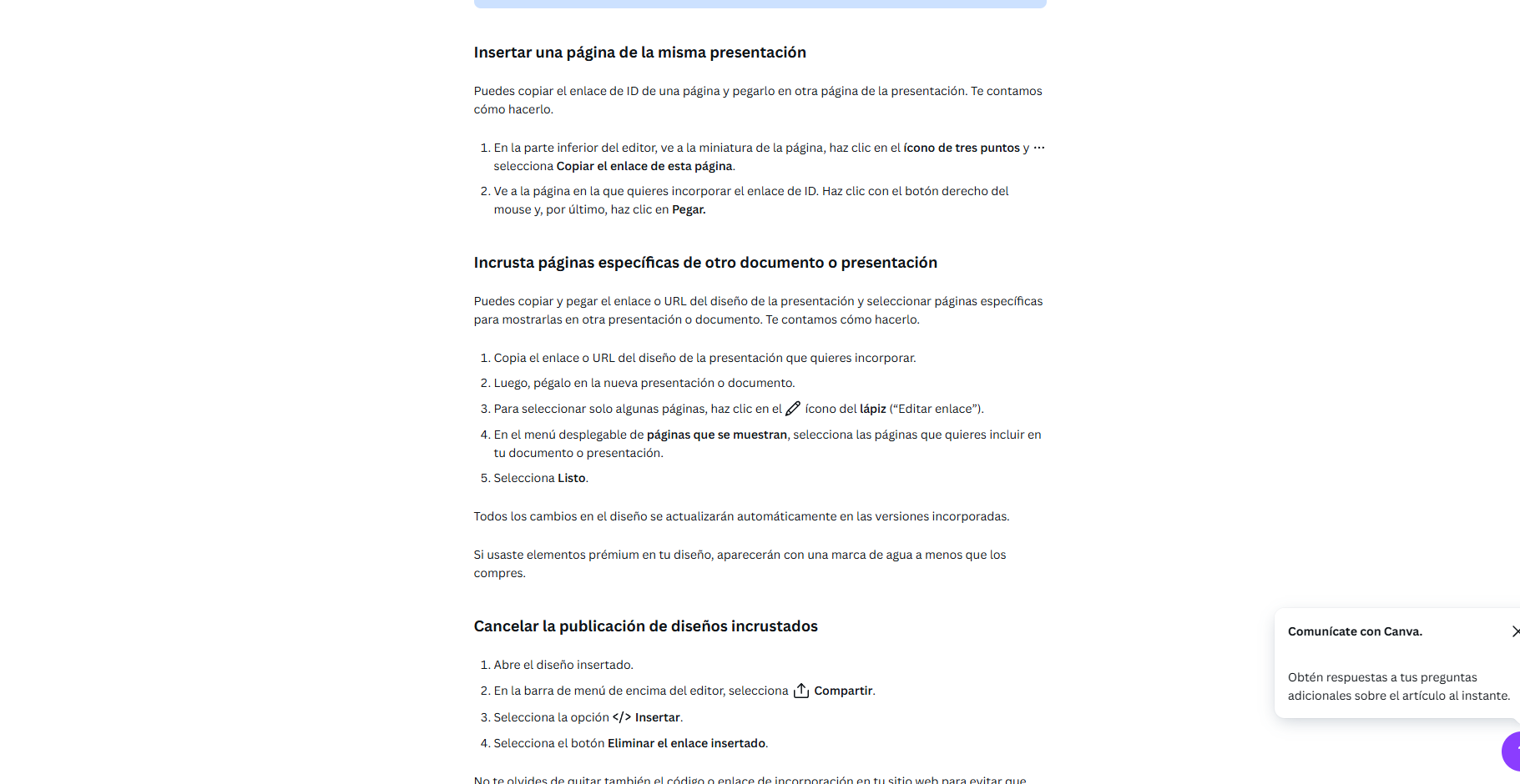 En tu captura de pantalla, parece que estás usando el código HTML para incrustar (iframe) en un bloque HTML personalizado. Si bien Canva proporciona un código para incrustar diseños, no todas las configuraciones de WordPress permiten iframes por defecto; algunos temas o plugins de seguridad pueden bloquearlos, lo que podría ser la razón por la que no se muestra correctamente.