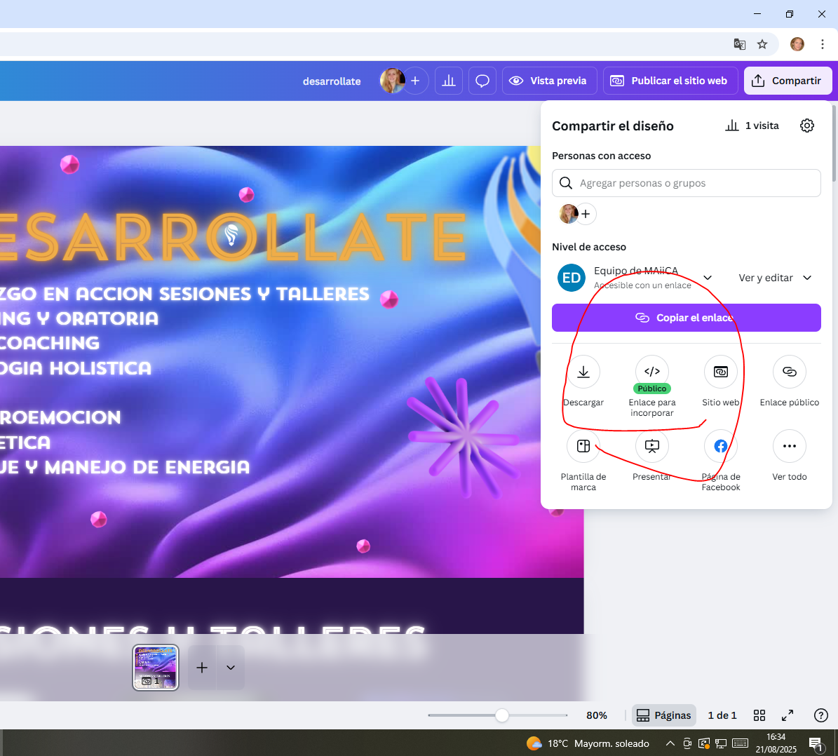 Si el código HTML para incrustar no funciona, Canva también ofrece un "enlace de incrustación inteligente" que puedes pegar directamente en WordPress. Para conseguirlo: