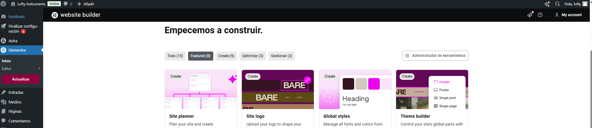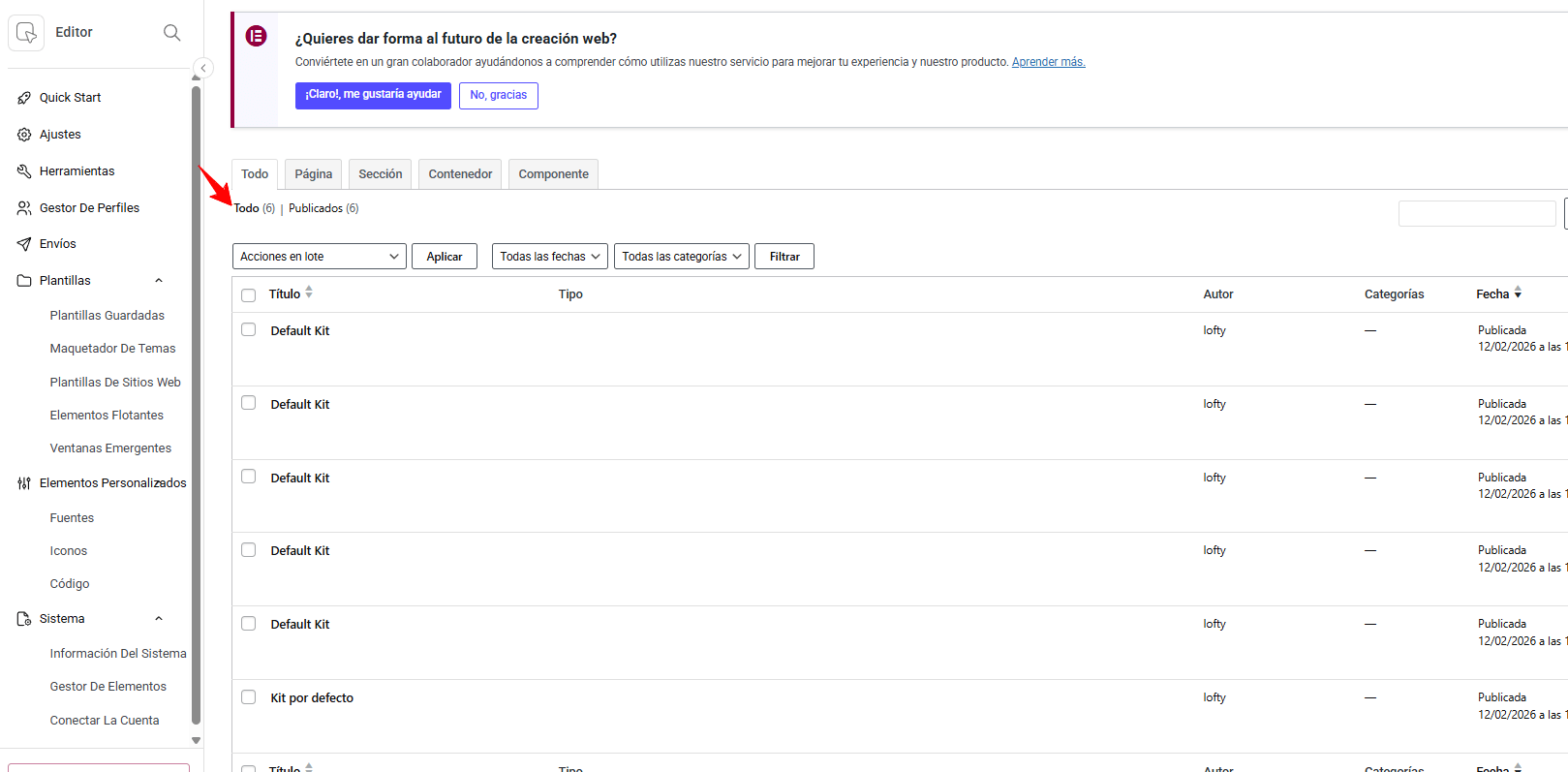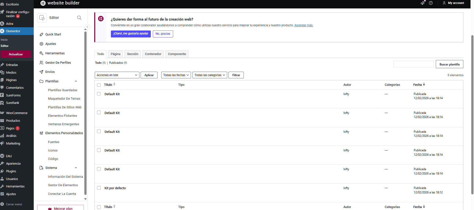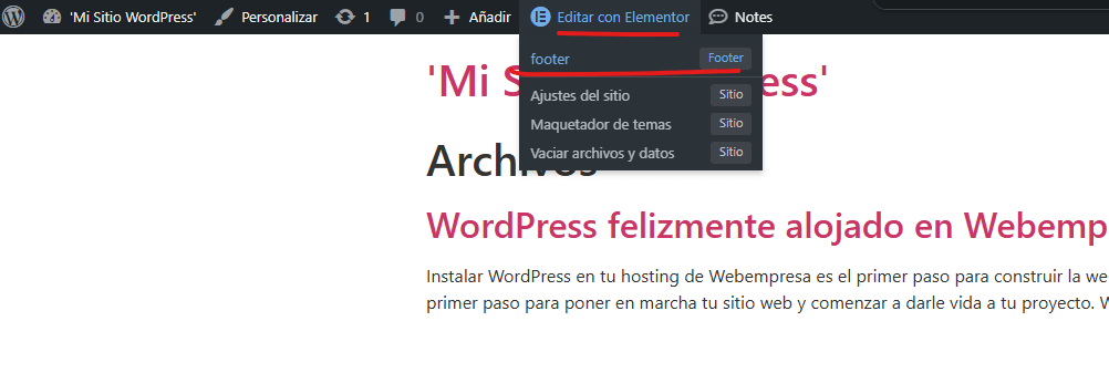 EN plantillas guardadas cuando le doy a todo es cuando aparecen esas 6 plantillas que te muestro en la imagen, pero en ningún lado aparece footer. ¿Puede que haya que pagar elementor para modificar esto?