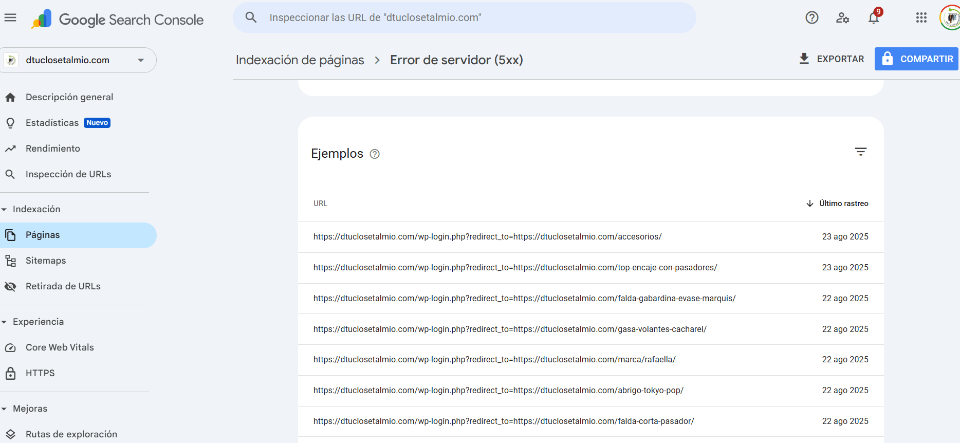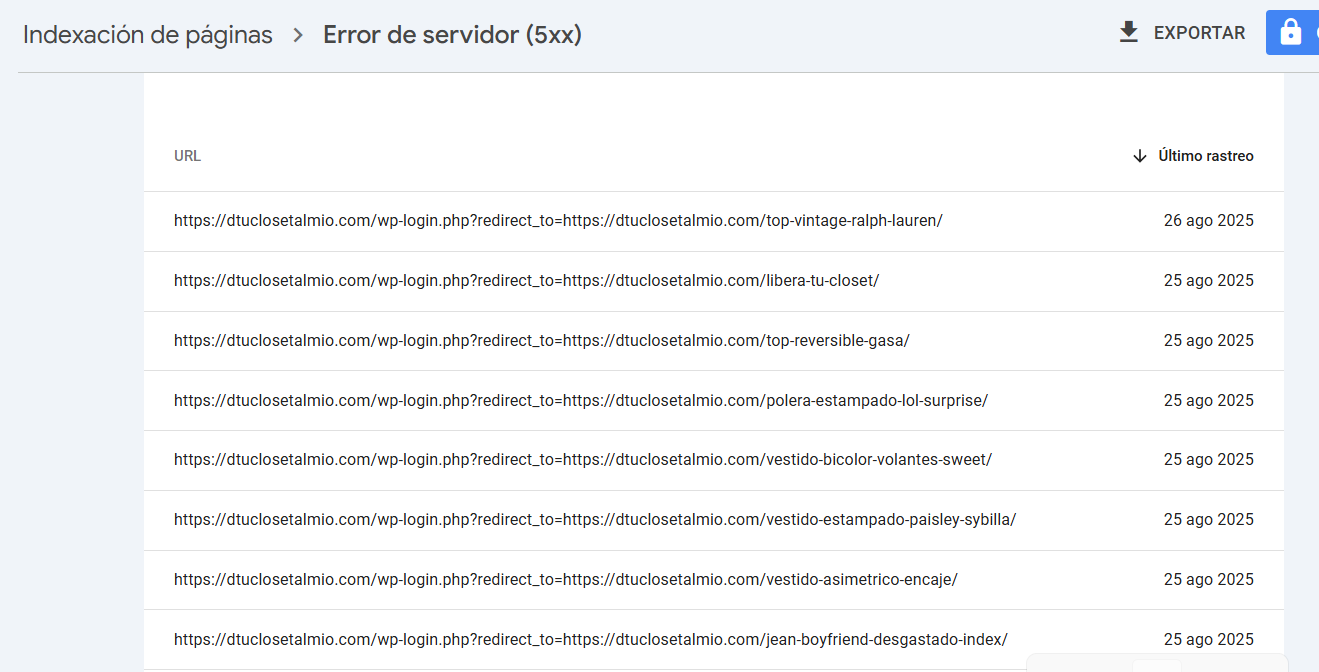 Al indexar mi sitio web varias aparecen más de 200 páginas sin indexar con error de servidor 5xx, según Search Console. Adjunto reporte. En Soporte de webempresa me indican que el problema puede estar relacionado con cómo realiza estas peticiones Google porque son siempre peticiones al wp-login.php de WordPress que se redirigen a otro apartado de la web. Indican que esta consulta está relacionada con el funcionamiento de mi página web y sus plugins, no con el alojamiento y que este tipo de consultas se gestionan desde el foro.
