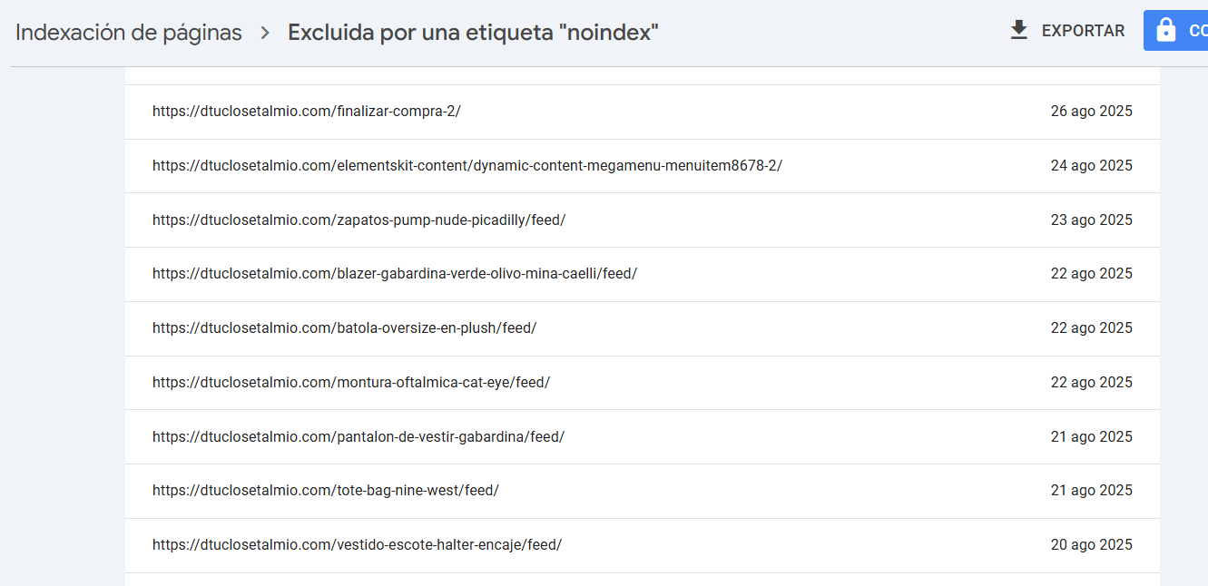 Sobre las URL excluidas en este caso estas están bien ya que estas URL están excluidas del index de Google, lo que debes verificar es que páginas de categorías o productos no se queden marcadas como no index.