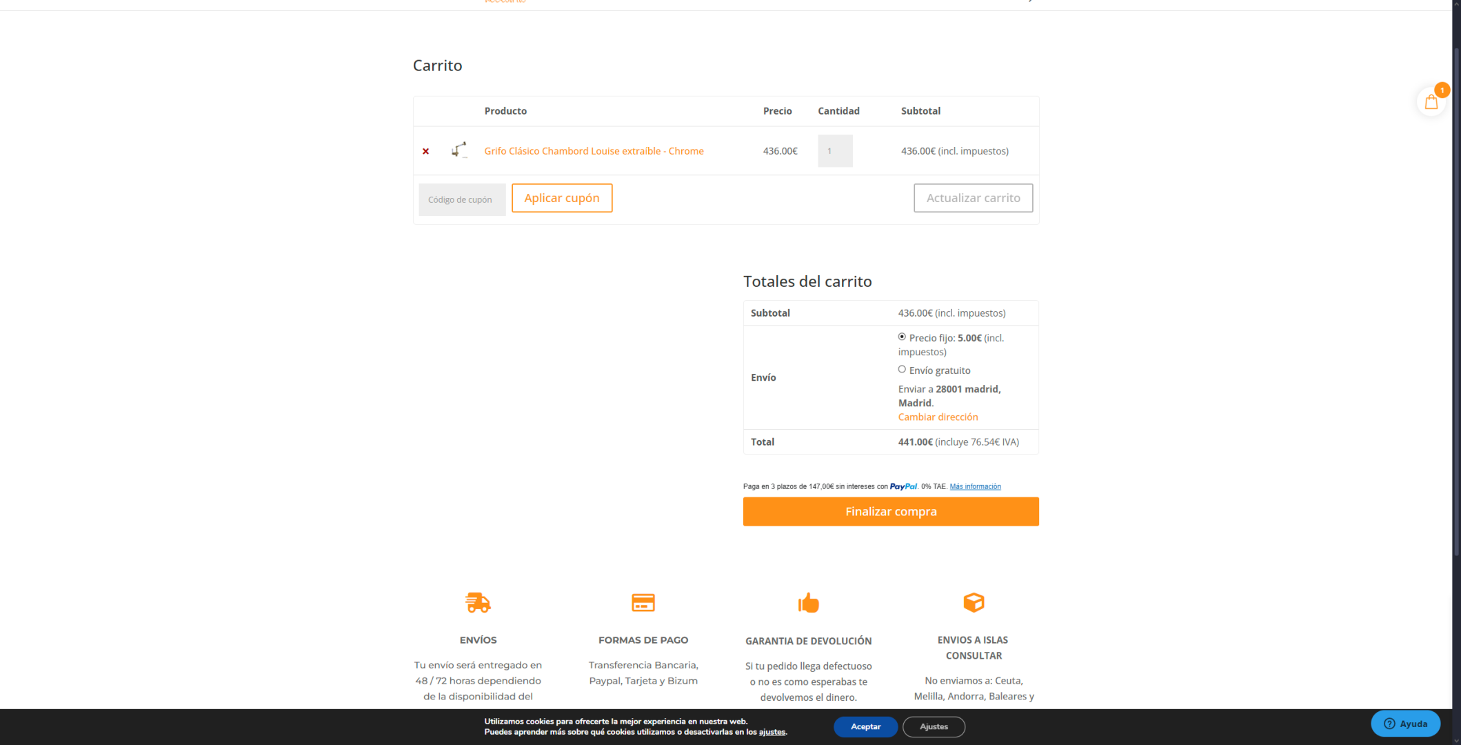 Aparte, el cliente ha pagado con Bizum que no tiene coste adicional y el sistema le ha cobrado un 3,5 por ciento mas de cargo de Paypal.