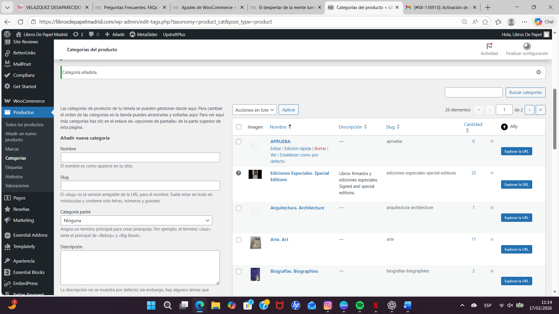 El problema es con las miniaturas, cuando añado una nueva categoría de producto o quiero editar la imagen de una categoría ya existente el botón de usar imagen no funciona. Por lo que no puedo ni añadir o cambiar fotografías.
