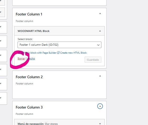 te explico. Desplegué "Footer Column 2" porque creía que era ahí donde tenía que quitar el menú lateral dcho q me aparecía y, al desplegarlo, ponía borrar y le di a borrar. No sé lo que borré de dentro de "footer Column 2". Como lo q te mando en la imagen de "footer Column 1", pues algo había dentro de "footer column 2" (al desplegarlo) q borré y q no sé lo q era ni sé si habrá afectado a la apariencia de la pagina. ¿Eso no se puede ver qué es lo que he borrado?