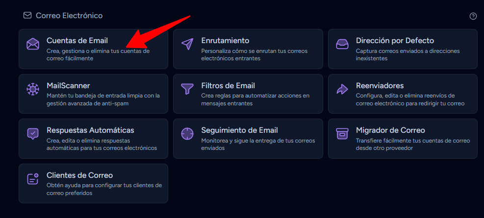 Una vez dentro de tu cuenta de hosting accede a Correo Electrónico → Cuentas de email