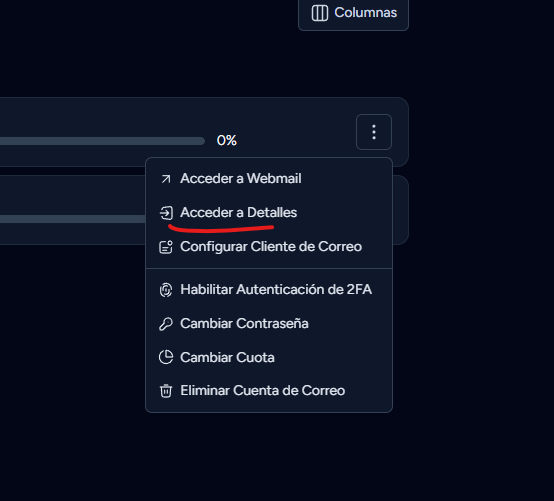 En este apartado verifica las cuentas que email que tienes creadas, seleccionas con la que deseas configurar el SMTP y pulsa en los tres puntitos que se encuentra al lado del correo