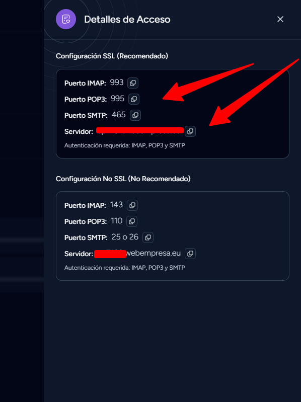En este menu seleccionas Detalles de Acceso y en ella localizas los datos de configuración de tu cuenta