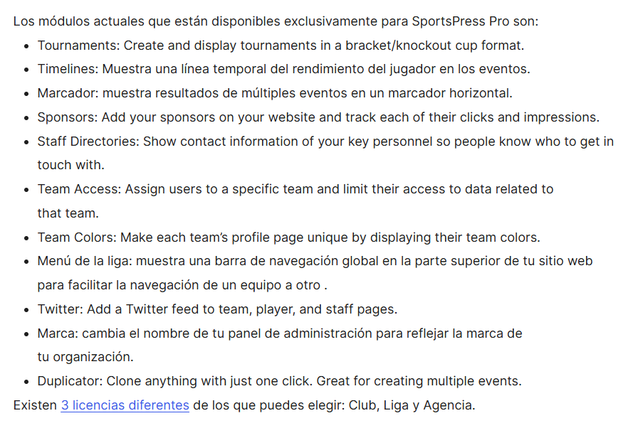 Tienes que consultarlo directamente con el soporte oficial de SportsPress Pro