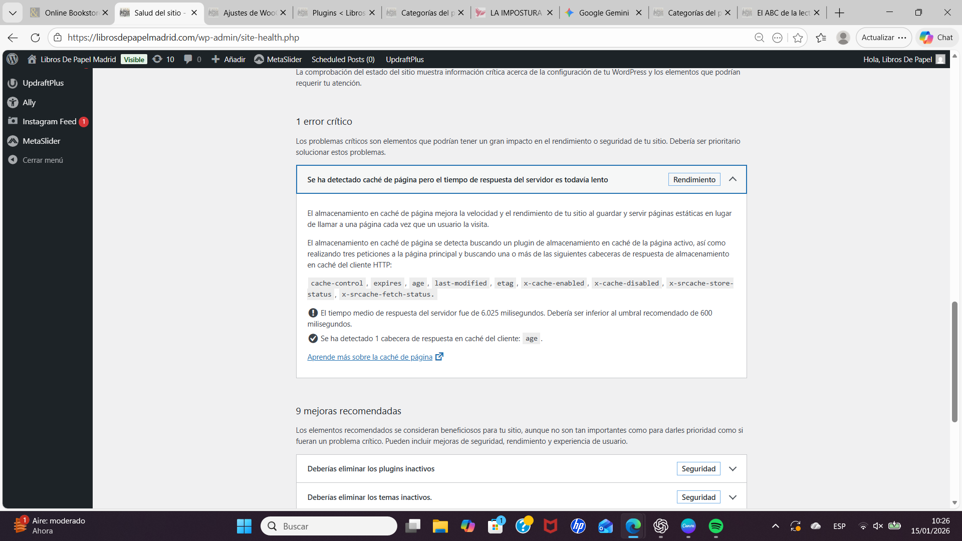 Adjunto captura de la salud del sitio donde se ve el retraso del servidor y captura de la biblioteca donde el botón no responde. ¿Podrían ayudarme a localizar qué script o archivo está fallando?