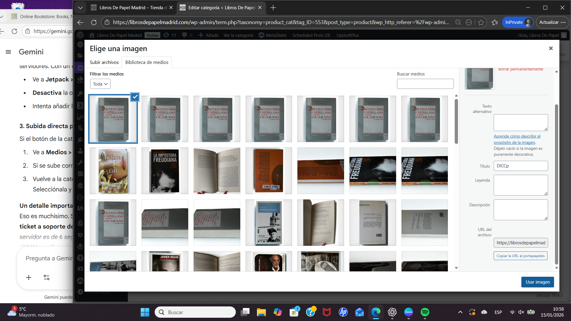 Tengo un problema persistente en mi WordPress: al intentar asignar una imagen a una categoría (o subir una nueva), la ventana de la biblioteca de medios se abre, me permite seleccionar la foto, pero al pulsar el botón "Usar imagen", la ventana se cierra y no se guarda ningún cambio.