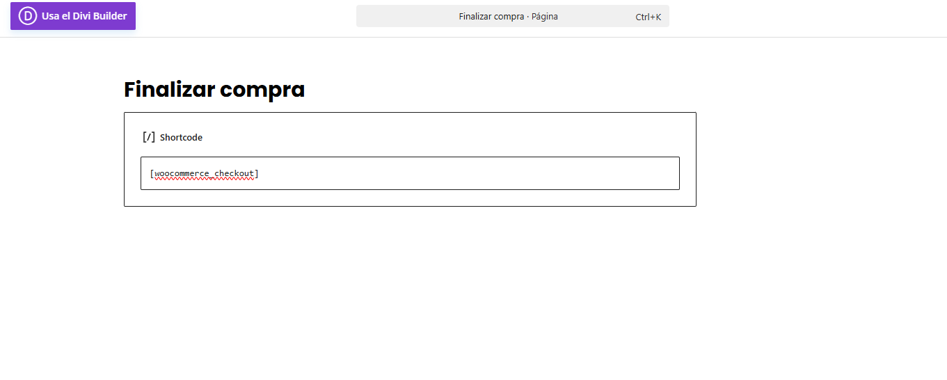 He borrado los elementos de la página de Finalizar compra, y he puesto un campo texto con el shortcode de WooCommerce que me indicas. Pero aunque ahora parece que funciona y he podido continuar el pedido, la página está desconfigurada, con espacios enormes entre campos, la pantalla aparece cortada y sin las cantidades del subtotal, envío,... Para verlo tenéis que entrar porque no os puedo poner capturas, no sé que pasa que no se pegan, ni puedo adjuntarlas.