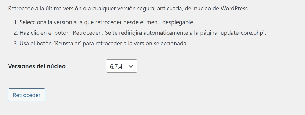 Una vez instalado lo activas sigues con los pasos que te indique antes para modificar la versión de WordPress:
