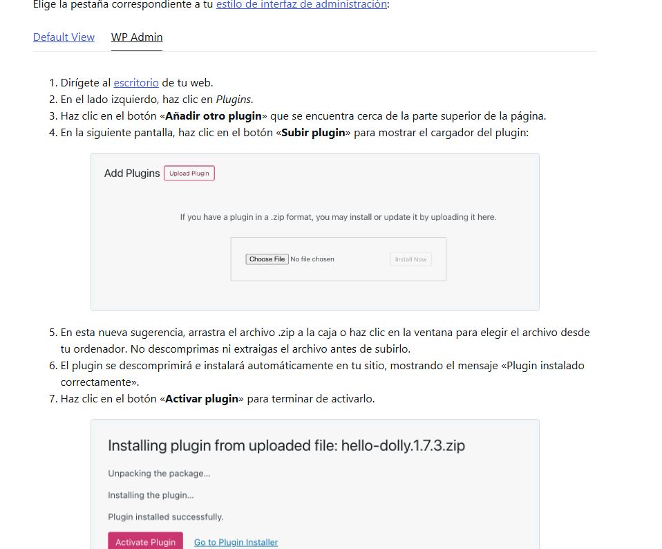 Ahora puede ser posible que esté el archivo ubicado en descargas de mi ordenador, con lo cual supongo que ya lo he descargado. Pero ahora, no es tan evidente lo de "accede a word press abre wordpress + plulgins + añadir plugin. A mi no me sale sí tan evidente cuando abro wordpress. Me sale esto
