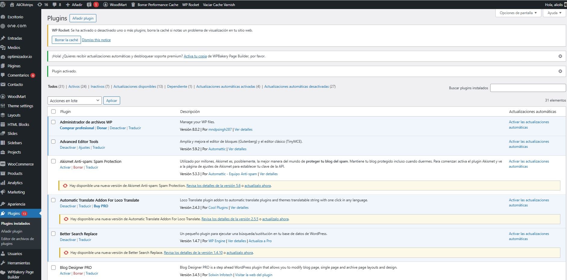 Lo ideal es que puedas actualizar tanto los plugins fundamentales como tu tema activo para garantizar el correcto funcionamiento de tu sitio web