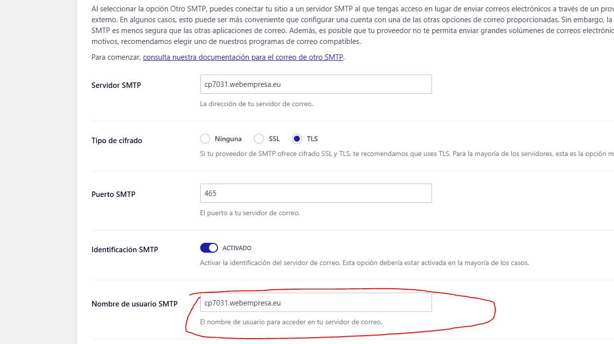 El nombre de usuario SMTP tiene que ser el correo del cual va a salir los mensajes, no vemos la captura completa pero es posible que tengas también algo mal en cuanto a la clave, esta debe ser la clave del correo es decir el nombre de usuario SMTP.