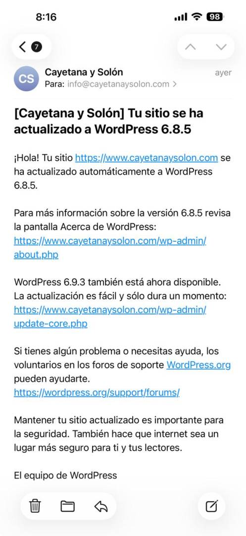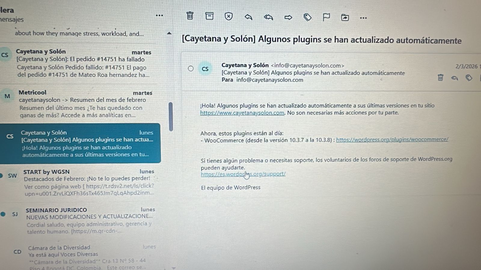 Hola, en dias pasados tuve un problema con esta pagina https://www.cayetanaysolon.com/ llego al administrador del sitio un correo notificándole que se habia actualizado automaticamente woocommerce a la version mas reciente y con esta actualizacion hubo un daño en la configuracion de los envios, unos dias despues llego otro correo notificando que ahora se habia actualizado automaticamente a la version mas reciente de wordpress y cuando revisamos se habia desactivado un plugin que despliega pestañas adicionales con informacion de producto en la tienda