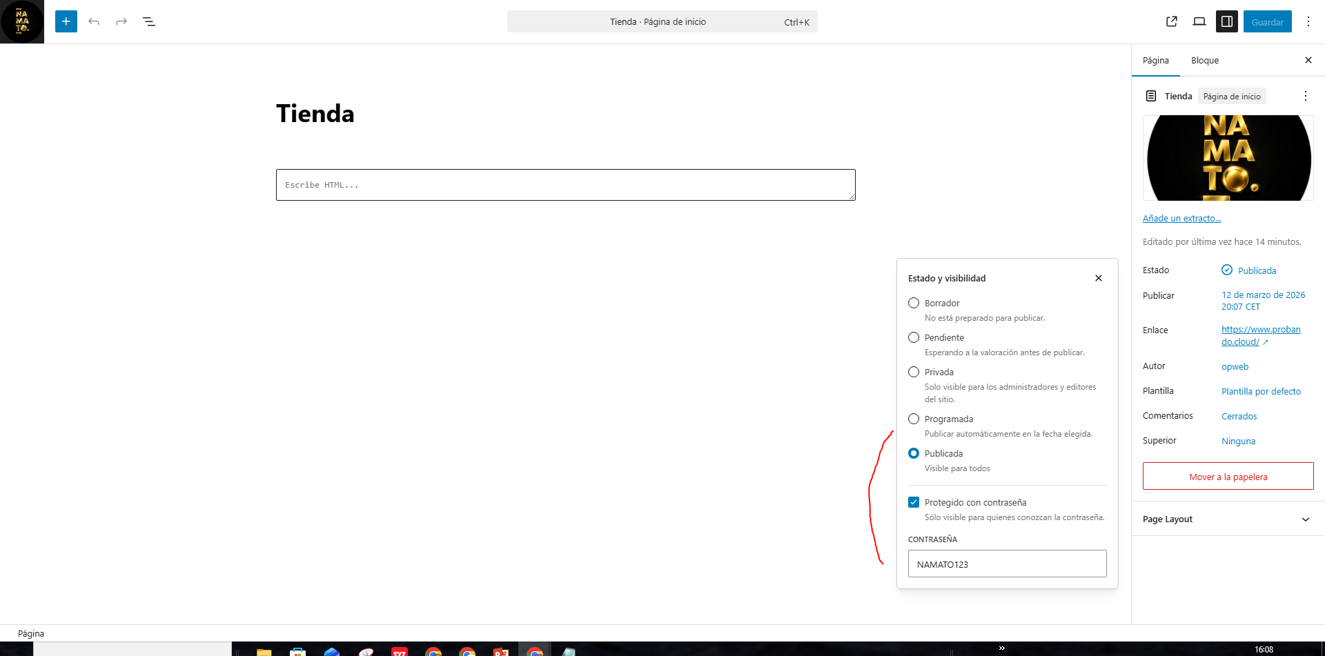Intenté proteger la página de la tienda para que, cuando las personas entren, se les solicite una contraseña antes de poder acceder al contenido. La idea es que solo quienes tengan la contraseña puedan ver la página de la tienda.