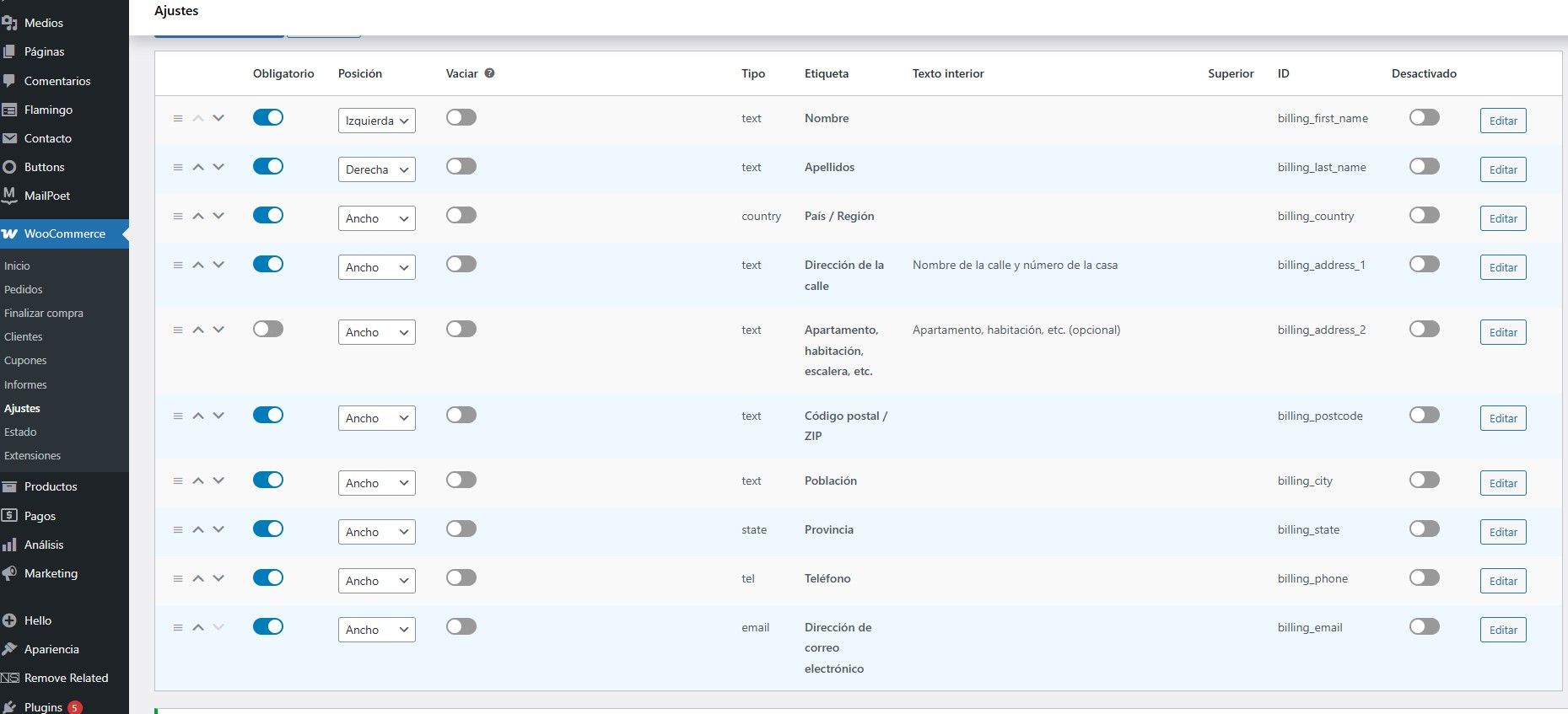 Buenas a todos, en la tienda de Woocomerce cuando alguien va a comprar un producto y llega a la página de "Finalizar compra" el campo del teléfono concretamente aparece como (opcional), quise cambiar eso por obligatorio (no solo el texto por defecto en el cuadro sino la condición) y no hay manera de cambiar ni los campos que aparecen ni su condición, he probado de todo, ni en el apartado "Formulario de pago" del plugin Woocomerce ni en un plugin que tengo que se llama "Flexible Checkout Fields" (creo que ni si quiera se como se activa).