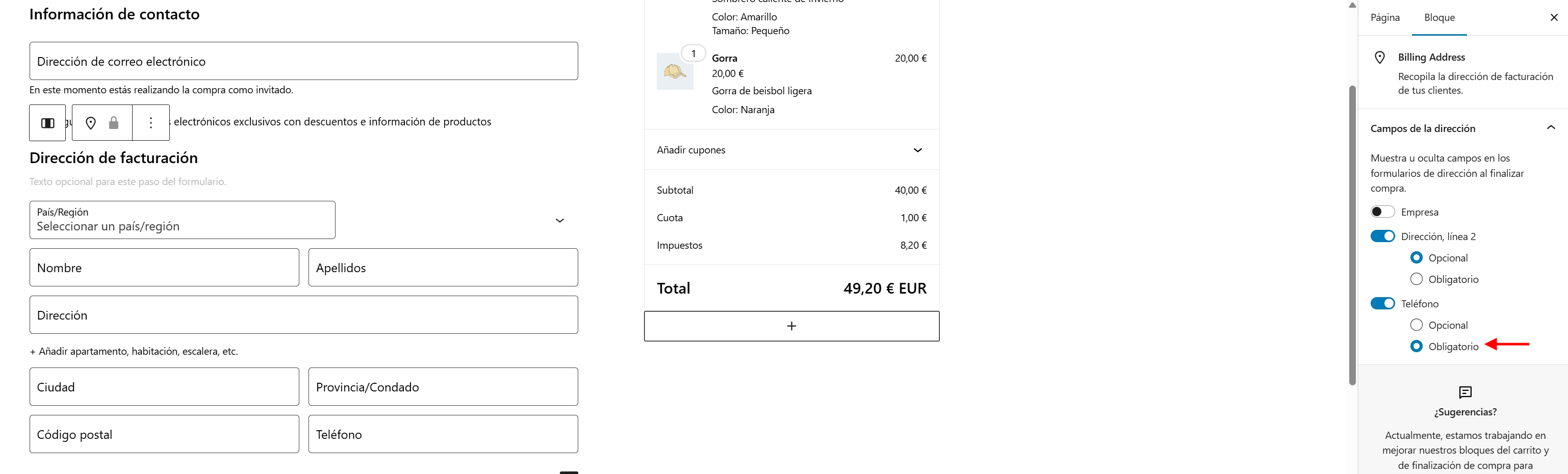 .- Selecciona el bloque Dirección de Facturación y selecciona la opción de teléfono como obligatoria