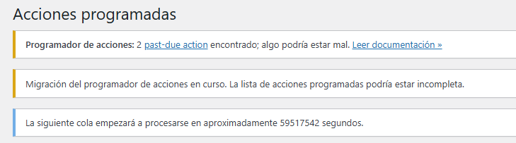 Buenas, tengo un WordPress con WooCommerce que desde hace un tiempo me viene dando problemas con las acciones programadas. Las acciones van venciendo sin ejecutarse y se van acumulando tareas vencidas. Además, pone que la siguiente cola comenzará dentro de casi 2 años. En los últimos días me ha salido un nuevo aviso indicando que la migración del programador de acciones está en curso, adjunto captura de pantalla de los avisos.