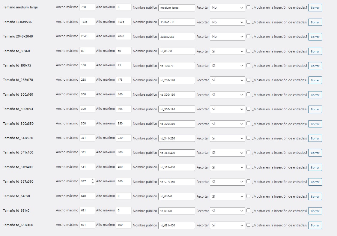 No sé si ese plugin no está funcionando o qué está pasando. QUisiera saber qué tamaños pudiera dejar y cuáles eliminar. Adjunto un pantallazo que muestra todas las miniaturas (16 aparte de las tres que no se pueden modificar)