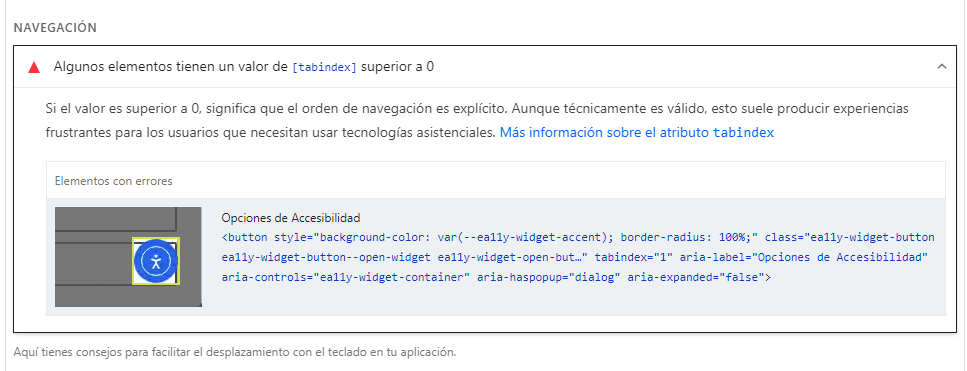 Además, me sigue indicando como elemento con errores el icono del plugin de Accesibilidad y no entiendo demasiado de código pero sí veo que aparece un tabindex="1"