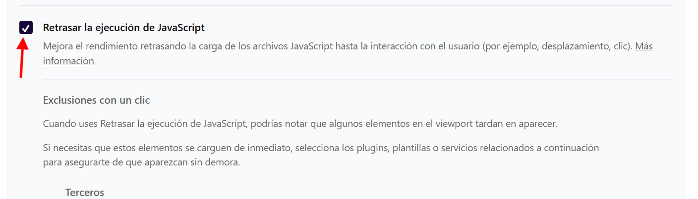 2. En WP Rocket, existe una opción llamada Retrasar la ejecución de JavaScript que me pidieron desactivar, ¿ya no debo activarla?, ¿correría el riesgo nuevamente de desordenar mi web?