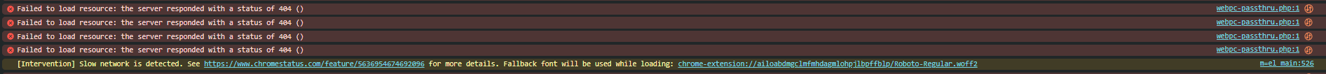 Esto se muestra ya que cuando se convierten las imagenes a un formato webp/avif reescribe las URL a https://dominio.com/wp-content/webpc-passthru.php, si el archivo no existen se generan errors 404 y las imagenes no cargan
