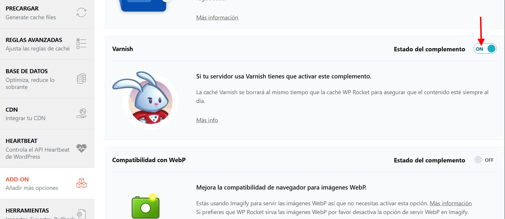 .- Accede a los ajustes de WP Rocket -> Add-on y activa la opción de Varnish