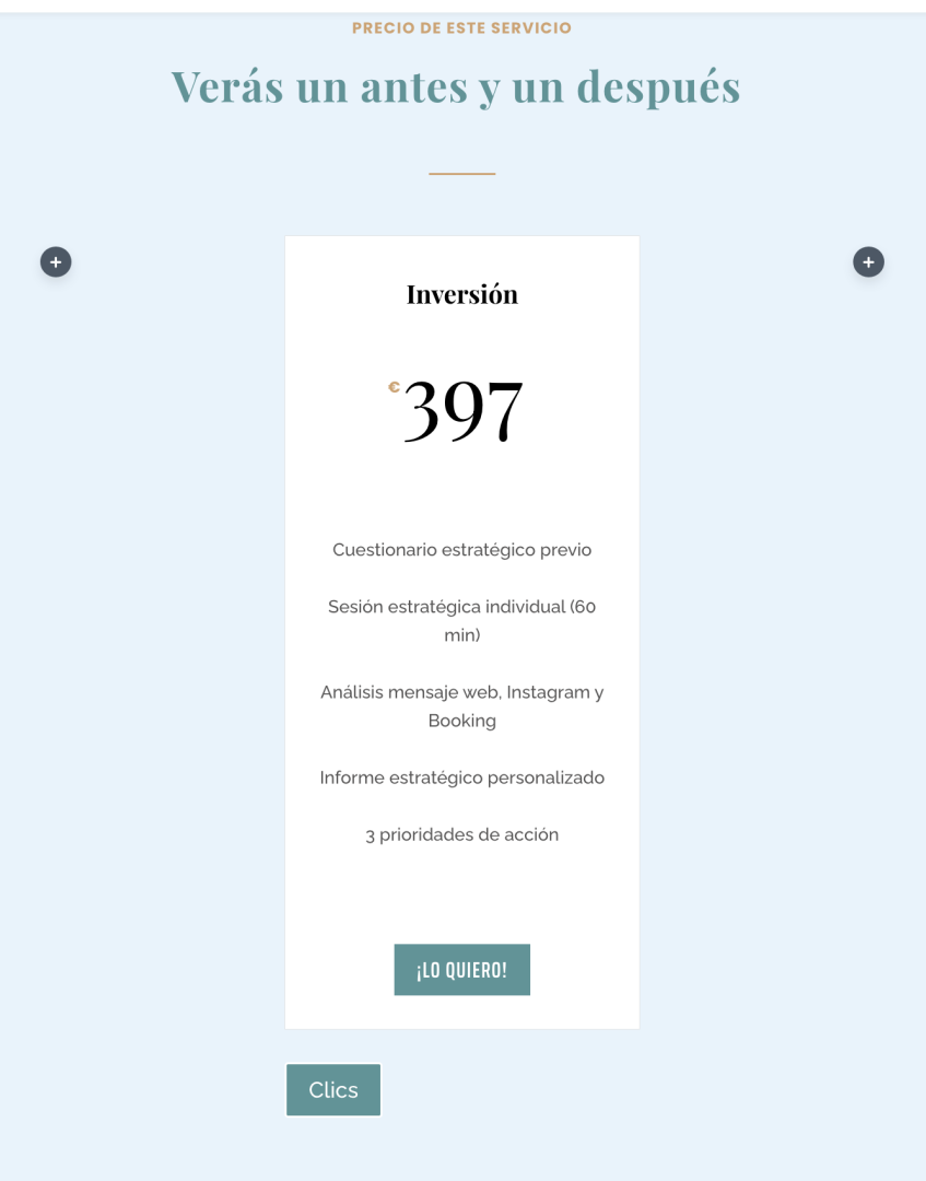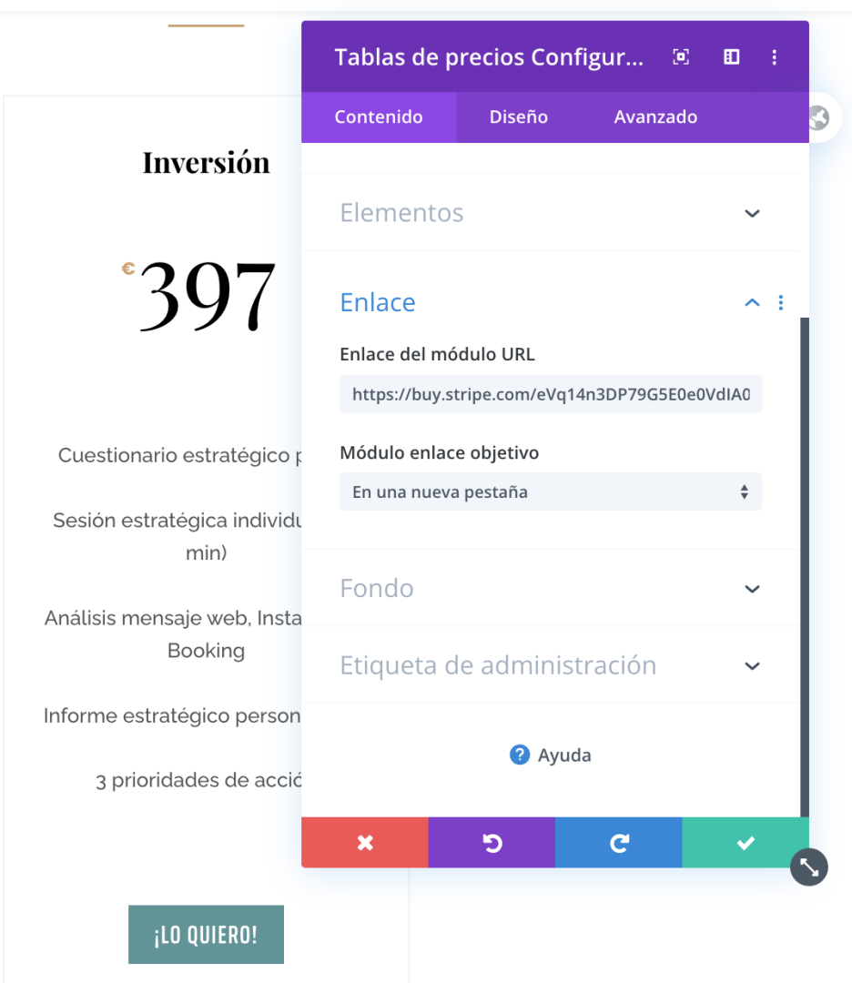 Em la plantilla solo veo una opción en la que pueda poner el enlace. Cuando lo hago así no funciona. Cuando creo un nuevo botón (pero este no está dentro de la caha de precios) sí puedo poner el enlace y funciona correctemente.