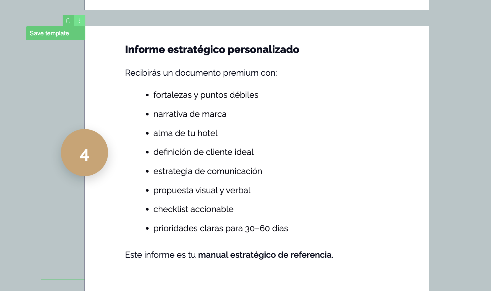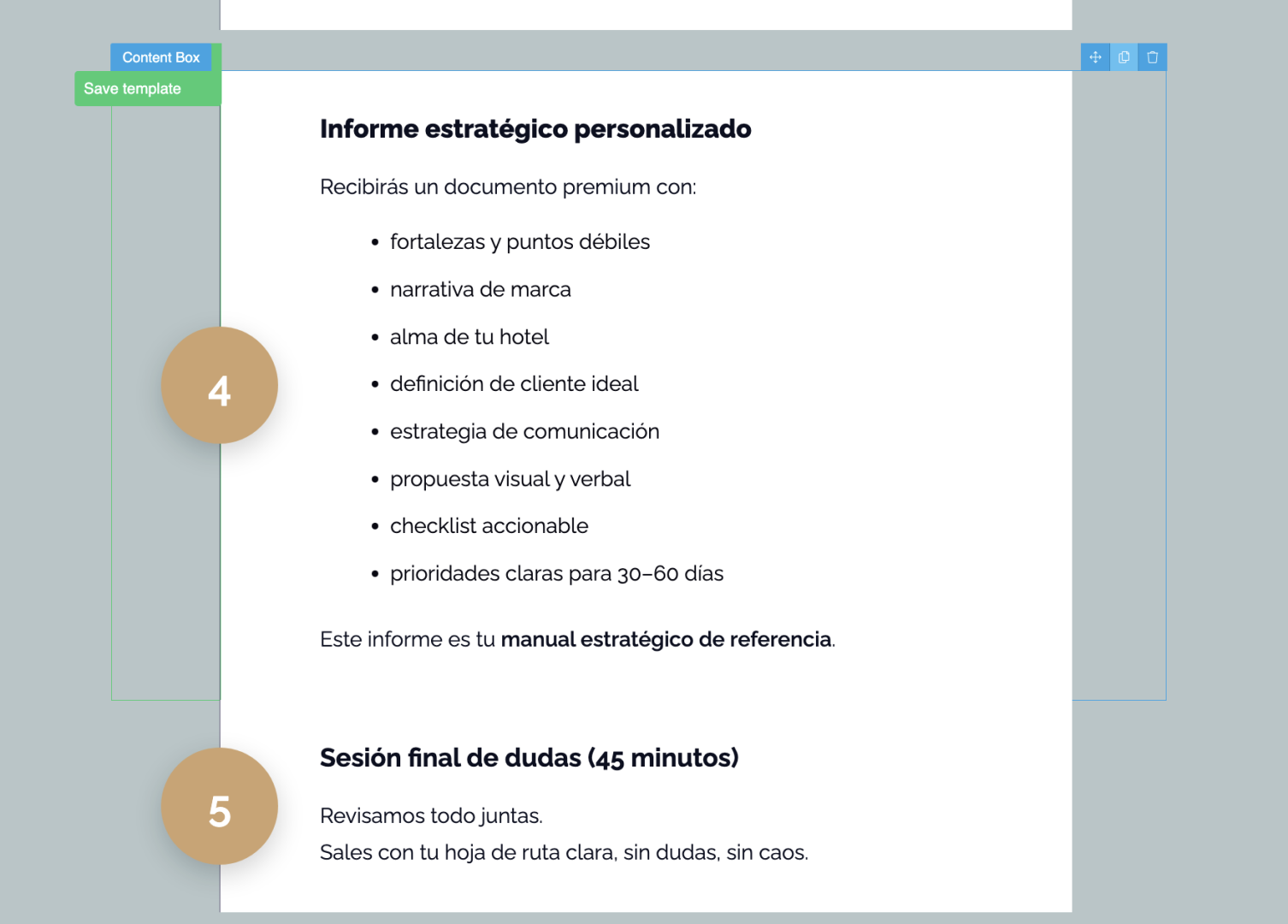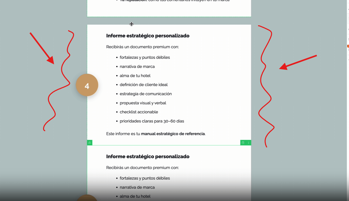 Entiendo que lo que deseas es que se muestre el espacio entre los puntos 4 y 5 tal como los puntos 1,2 y 3 del apartado de Qué incluye Haz Brillar tu Hotel – Método ALMA