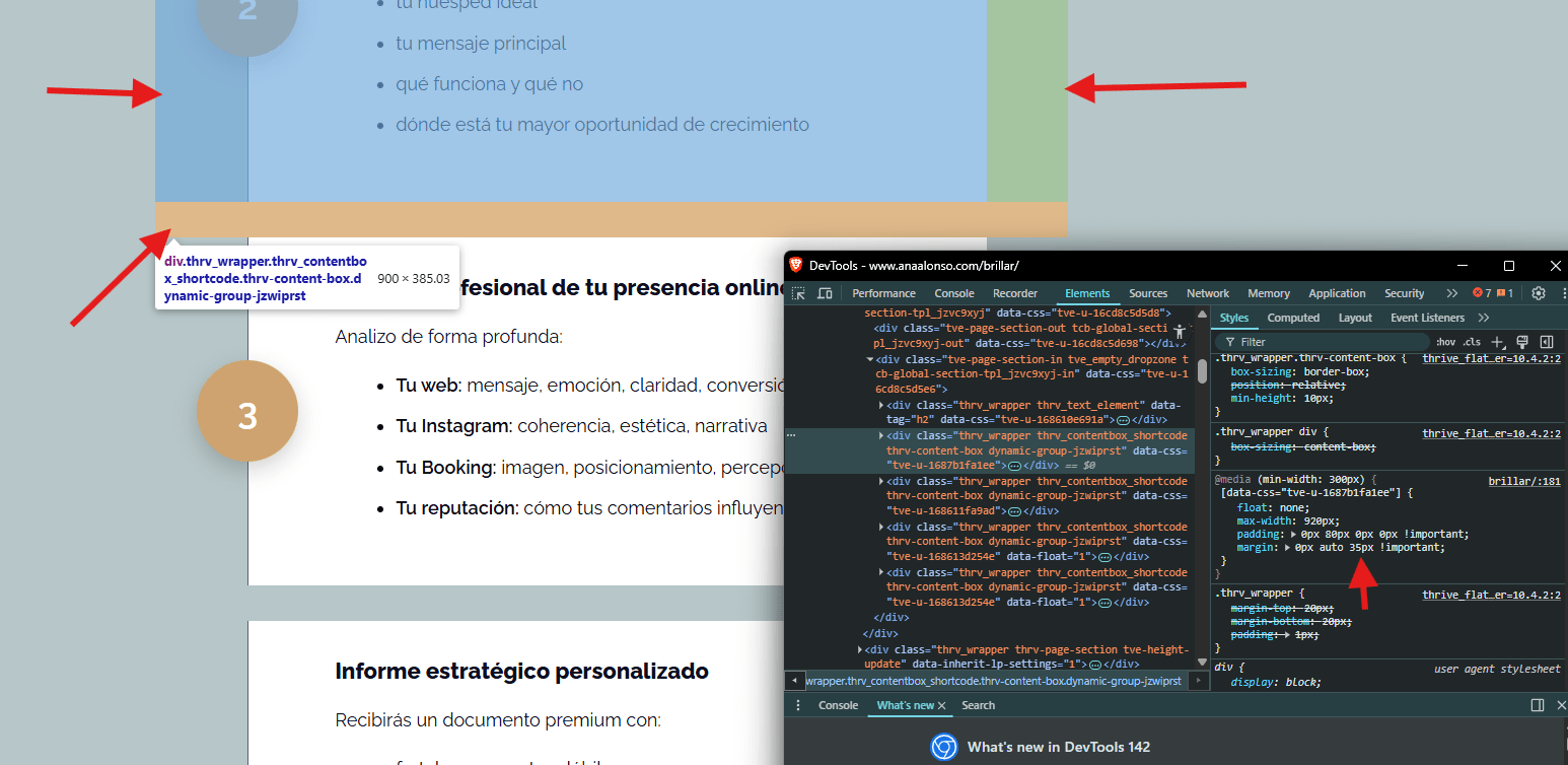 1. Estoy usando una plantilla para el apartado en el que indico lo que incluye el servicio. He copiado el bloque, pero no me aparece la separación (marcado en rojo).