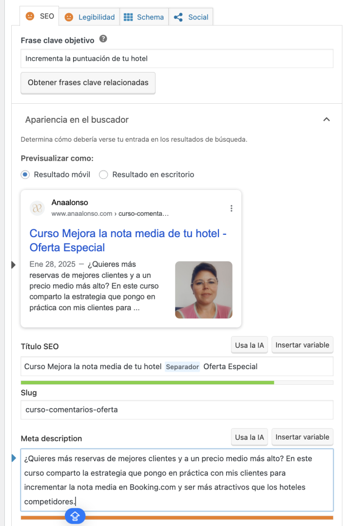 Cuando realizo la descripción meta para la página me sale una imagen que me gustaría cambiar ya que es la foto de una clienta y quiero que salga la mía o la del curso.