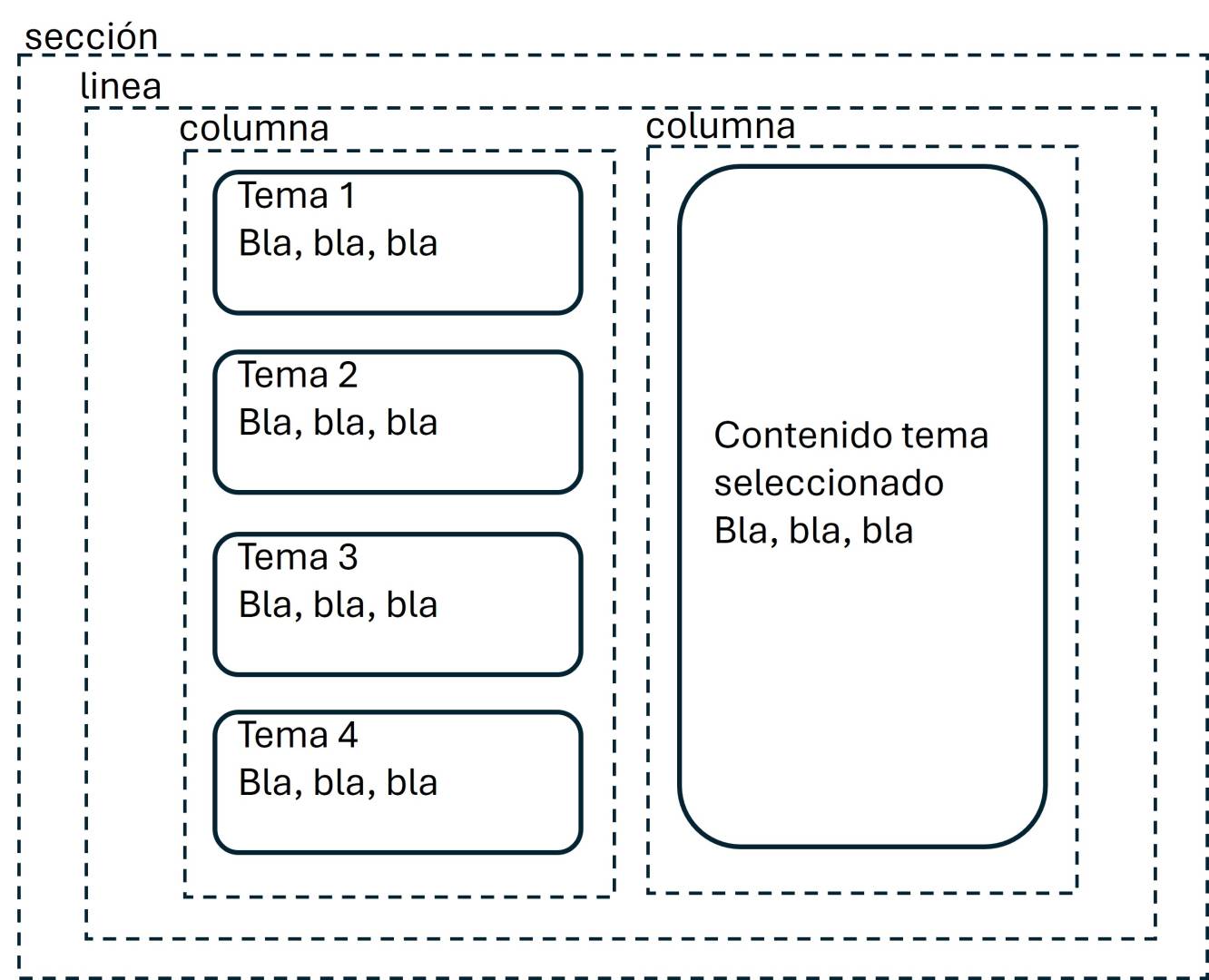 Al cargar la página, se muestran los titulos (temas 1....4, en 4 modulos, uno debajo de otro), y por defecto se hace visible el contenido del tema 1 en el modulo de texto de la columna derecha.