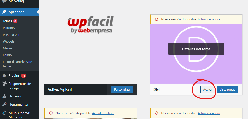 En este caso si deseas tener las opciones generales de Divi debes activar el tema padre, ya que el tema WPfacil es un tema hijo de Divi. Para ello accede a Apariencia → Temas