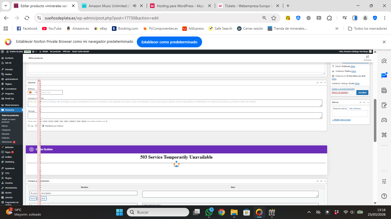 Al mirar mis productos de woocomerce , me sale la pantalla rara a la izquierda y en la parte del divi builder me sale error 503 service temporalily unavailable
